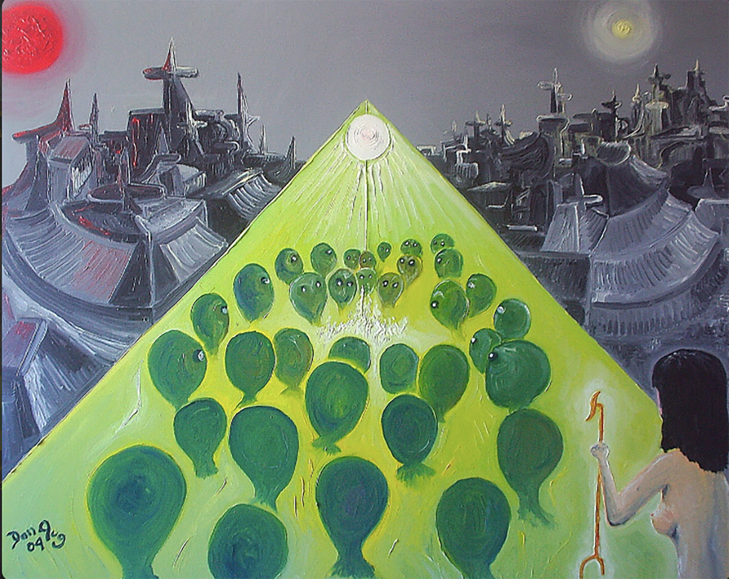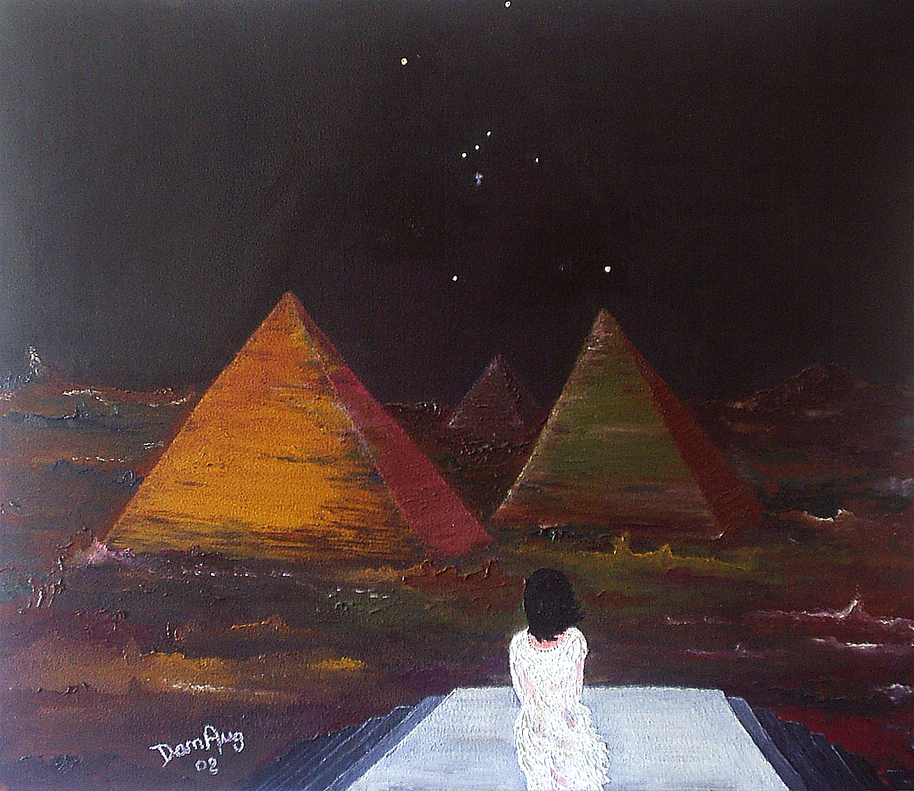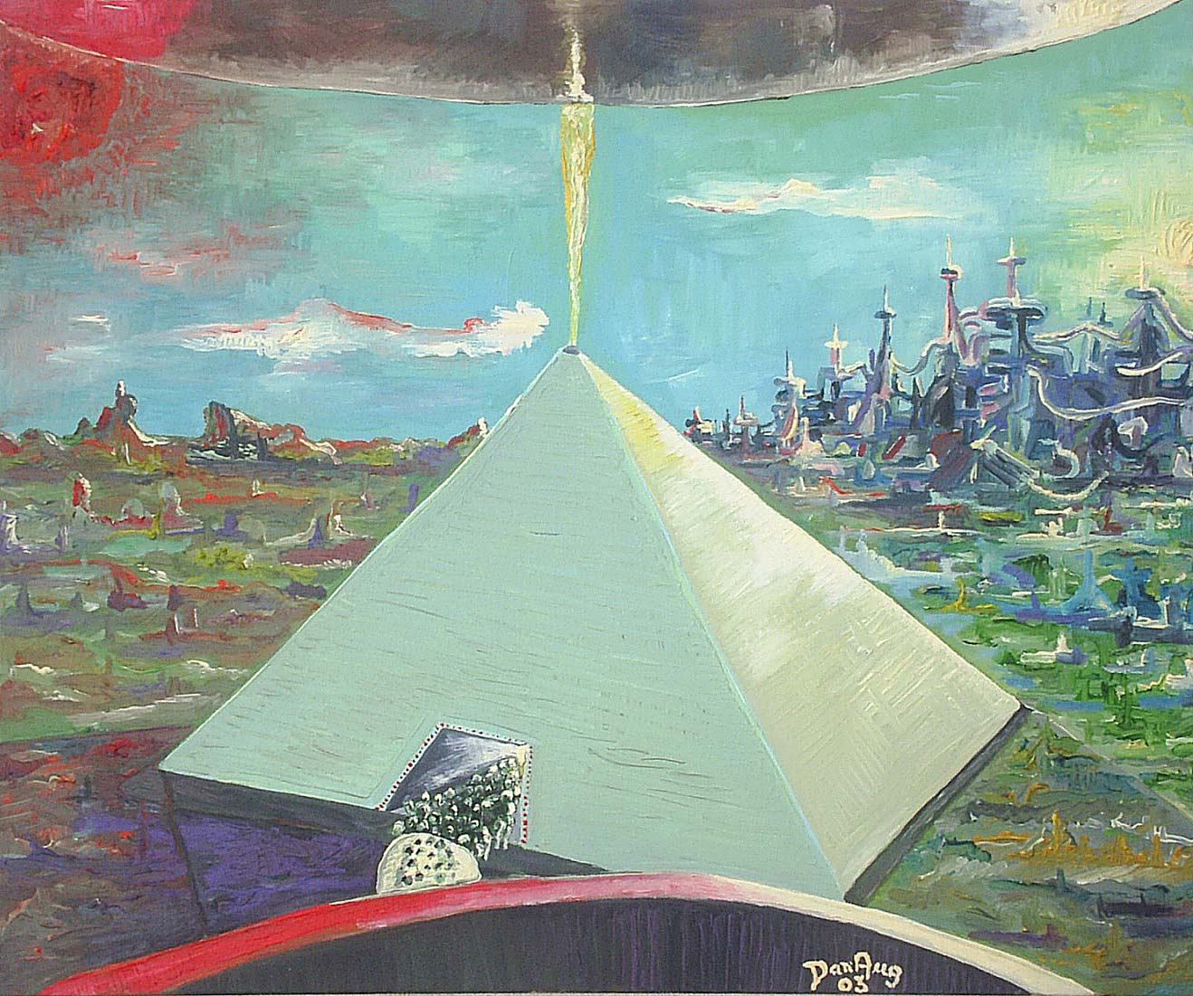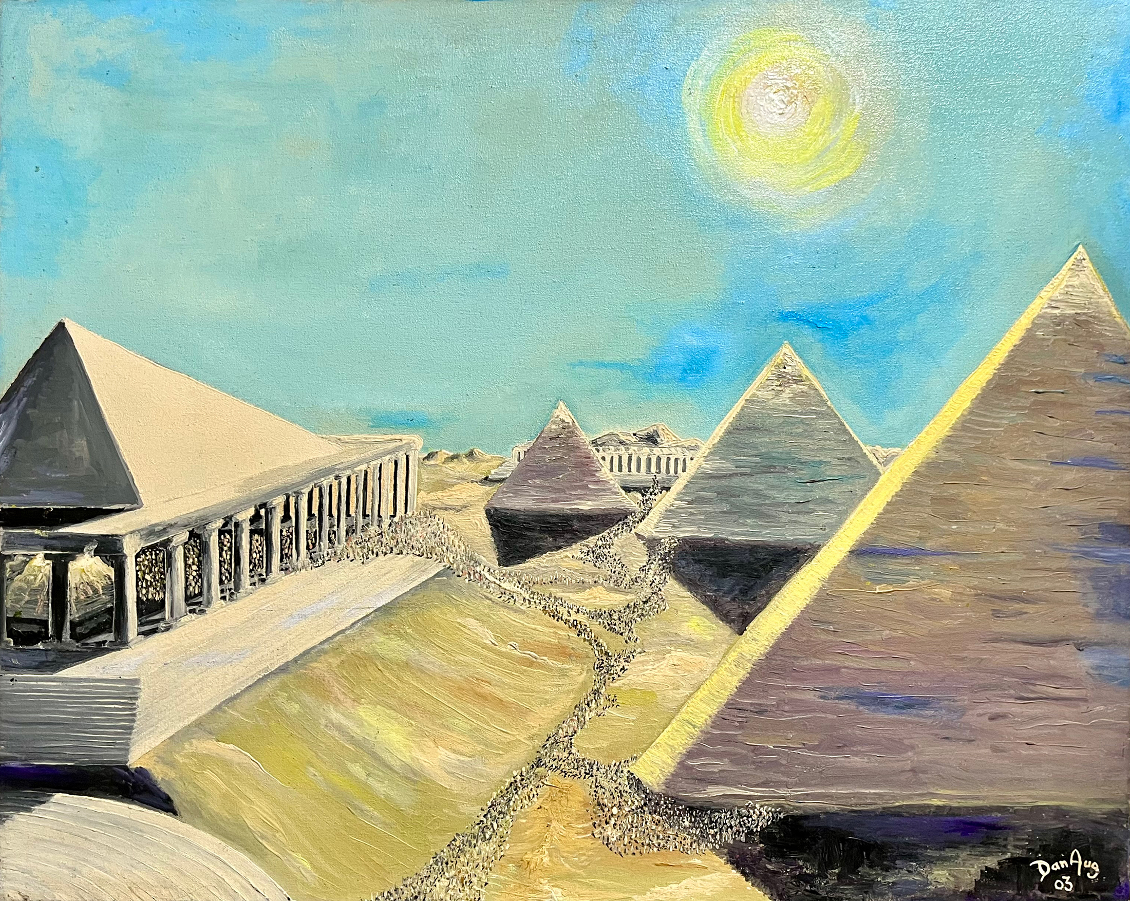 Rotating selection of artworks from Dan Aug’s 46-pieces Art Series, Dream of a Night in Giza. This slideshow highlights key paintings that weave astronomy, Egyptian myth, and speculative fiction into a single visual narrative. Each image appears at full proportion to honor texture, metallic sheen, and geometric construction, then flows to the next with a steady cadence. Together, these pieces trace the journey of Neferu across time and cosmos—inviting contemplation, wonder, and a sense of radiant mystery that lingers between frames.